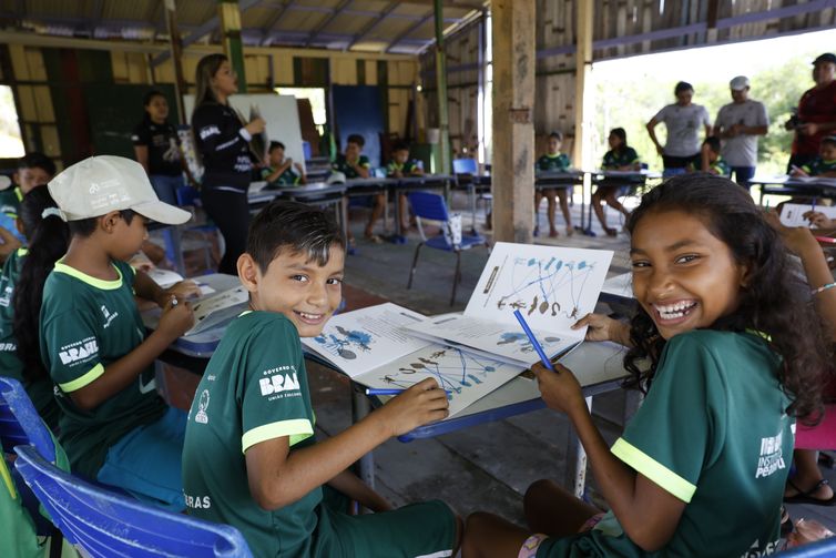 Crianças da Vila dos Pescadores de Ajuruteua participam da Alfamangue, atividade de alfabetização baseada na temática do manguezal do Projeto Mangues da Amazônia, na área da Reserva Extrativista Marinha de Caeté-Taperaçu. Fernando Frazão/Agência Brasil